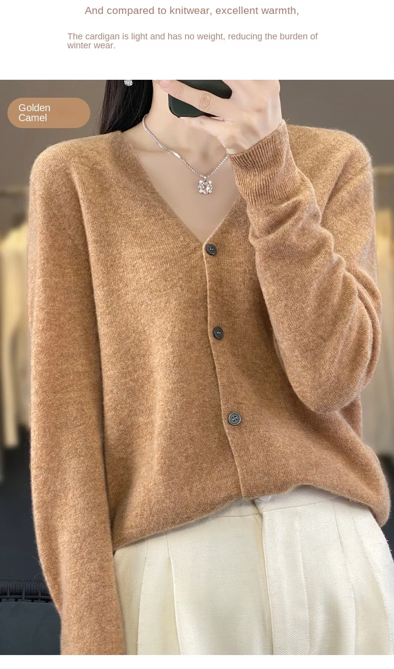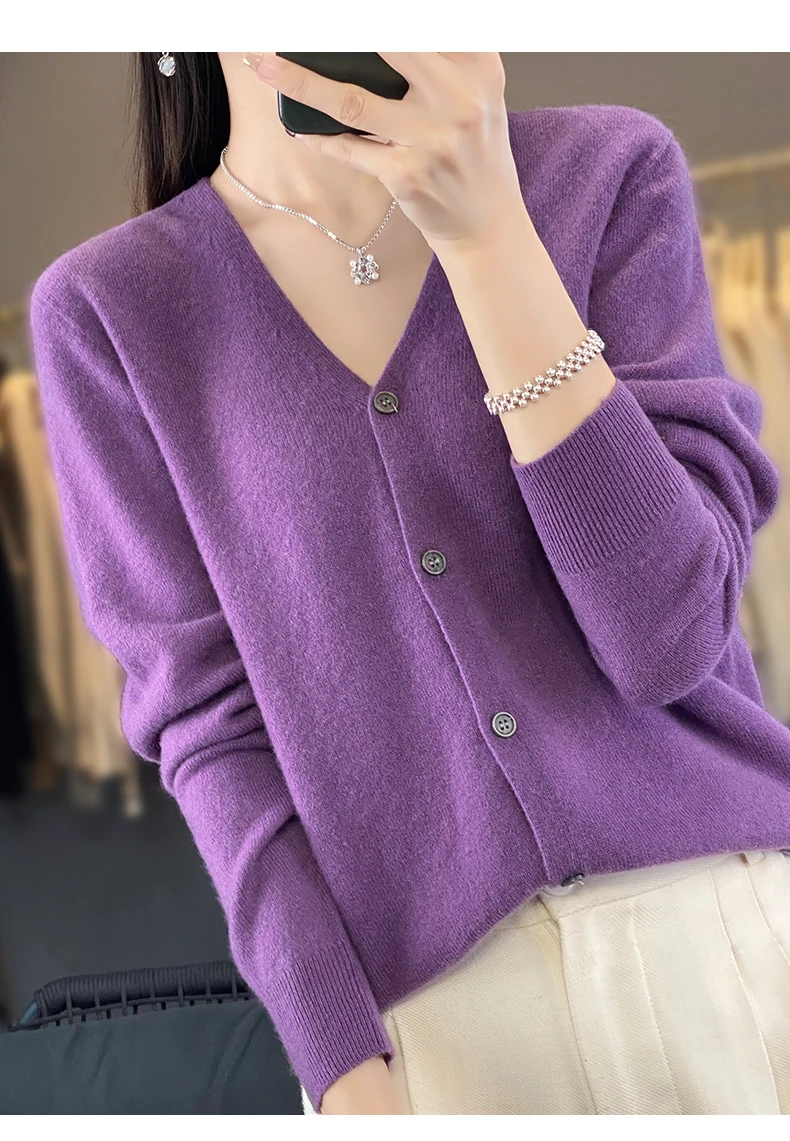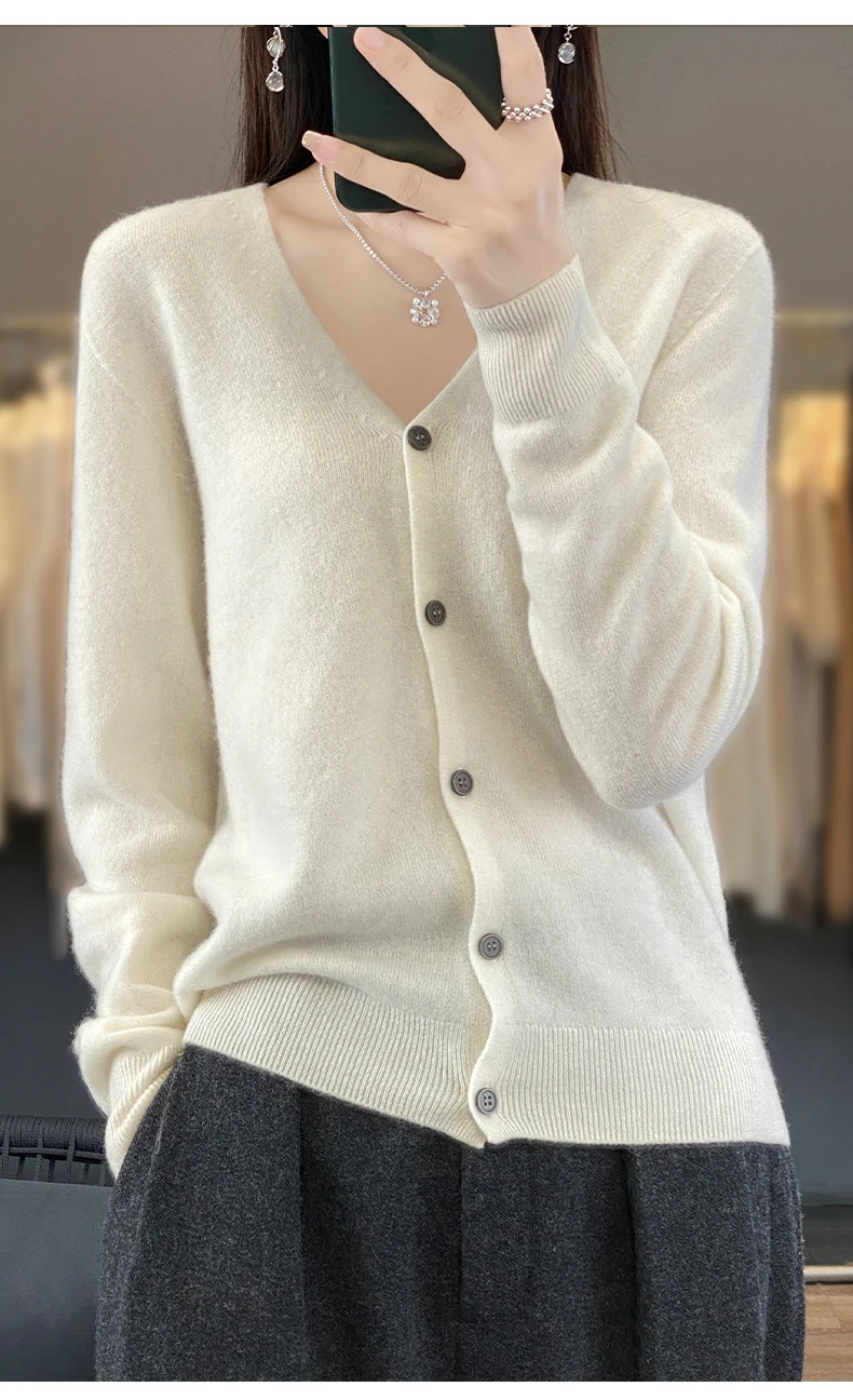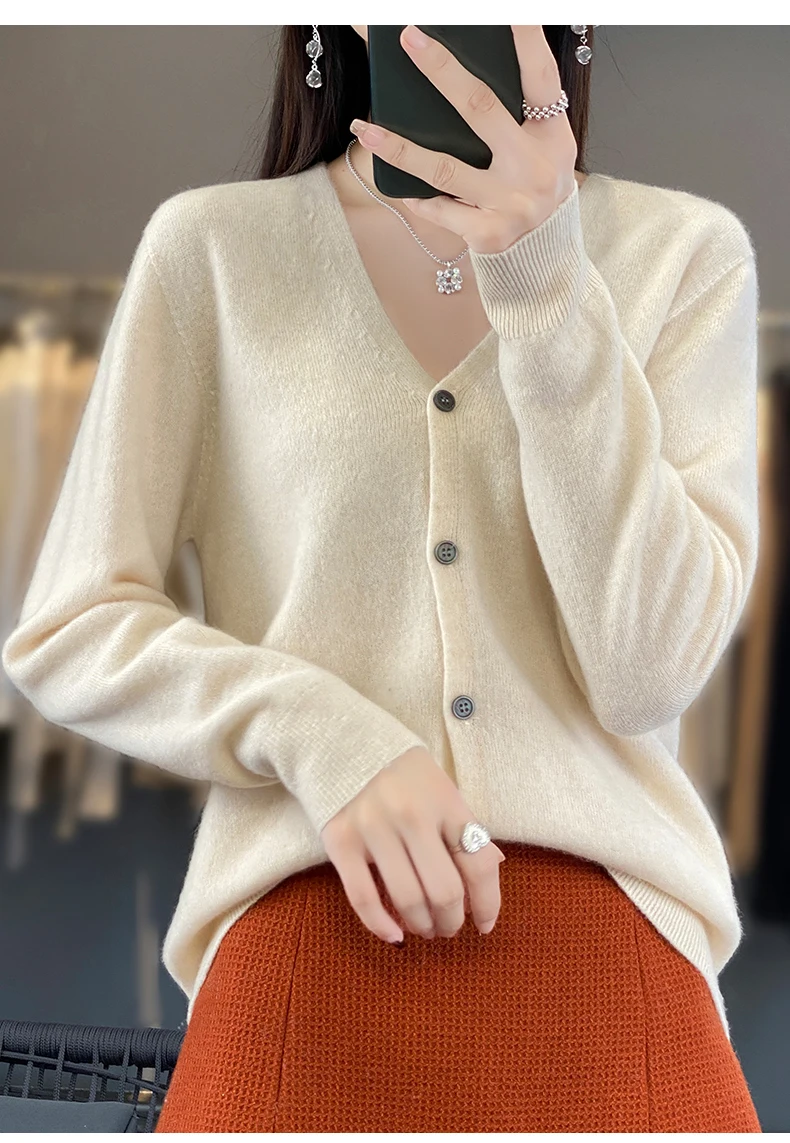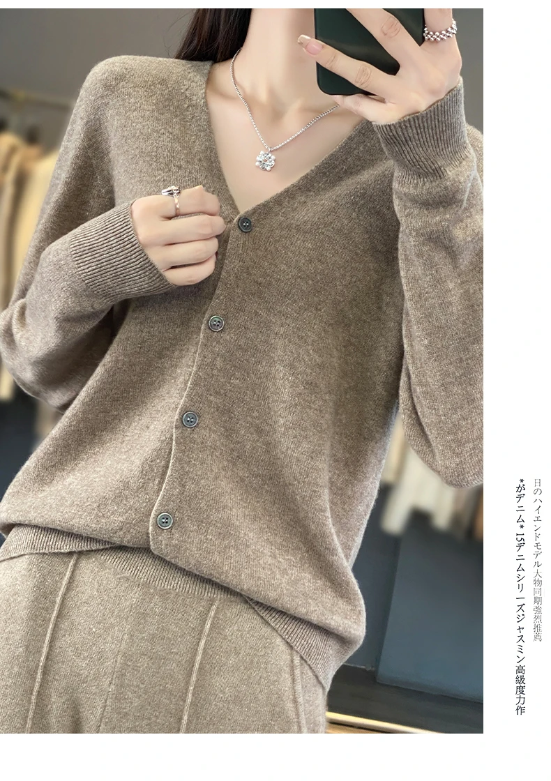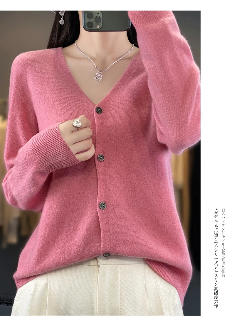 Autumn And Winter New Cardigan 100% Merino Wool Knitted V-neck Sweater For Women, Loose And Soft Cashmere Sweater WQ015