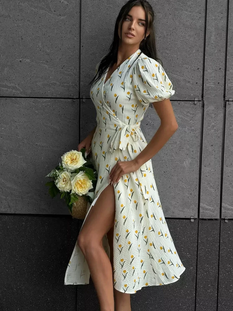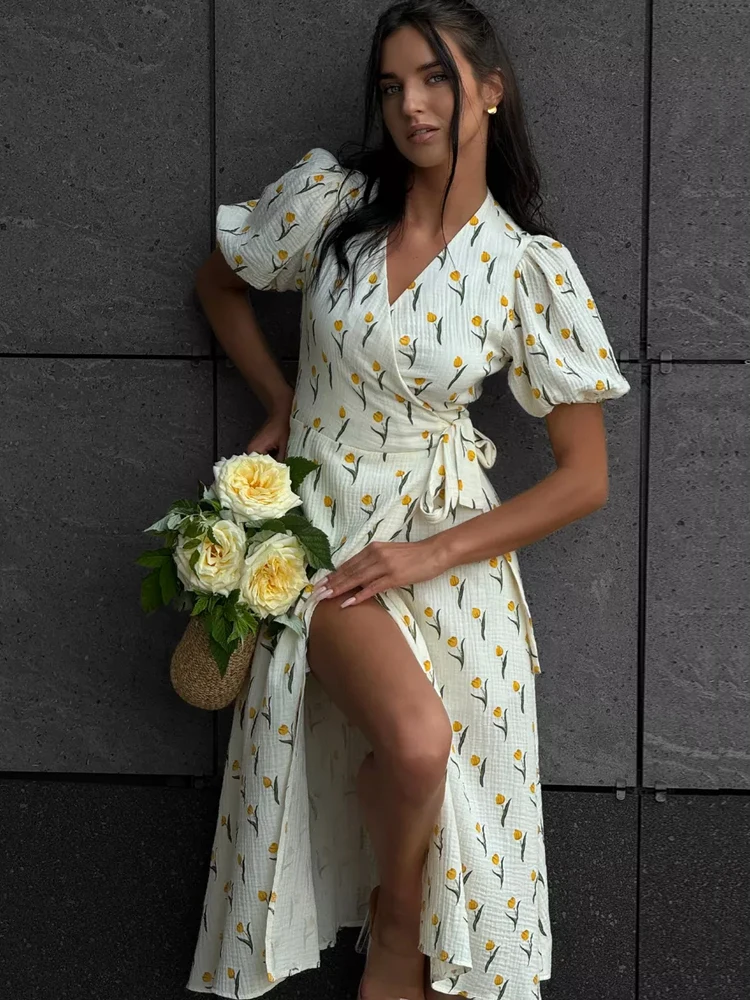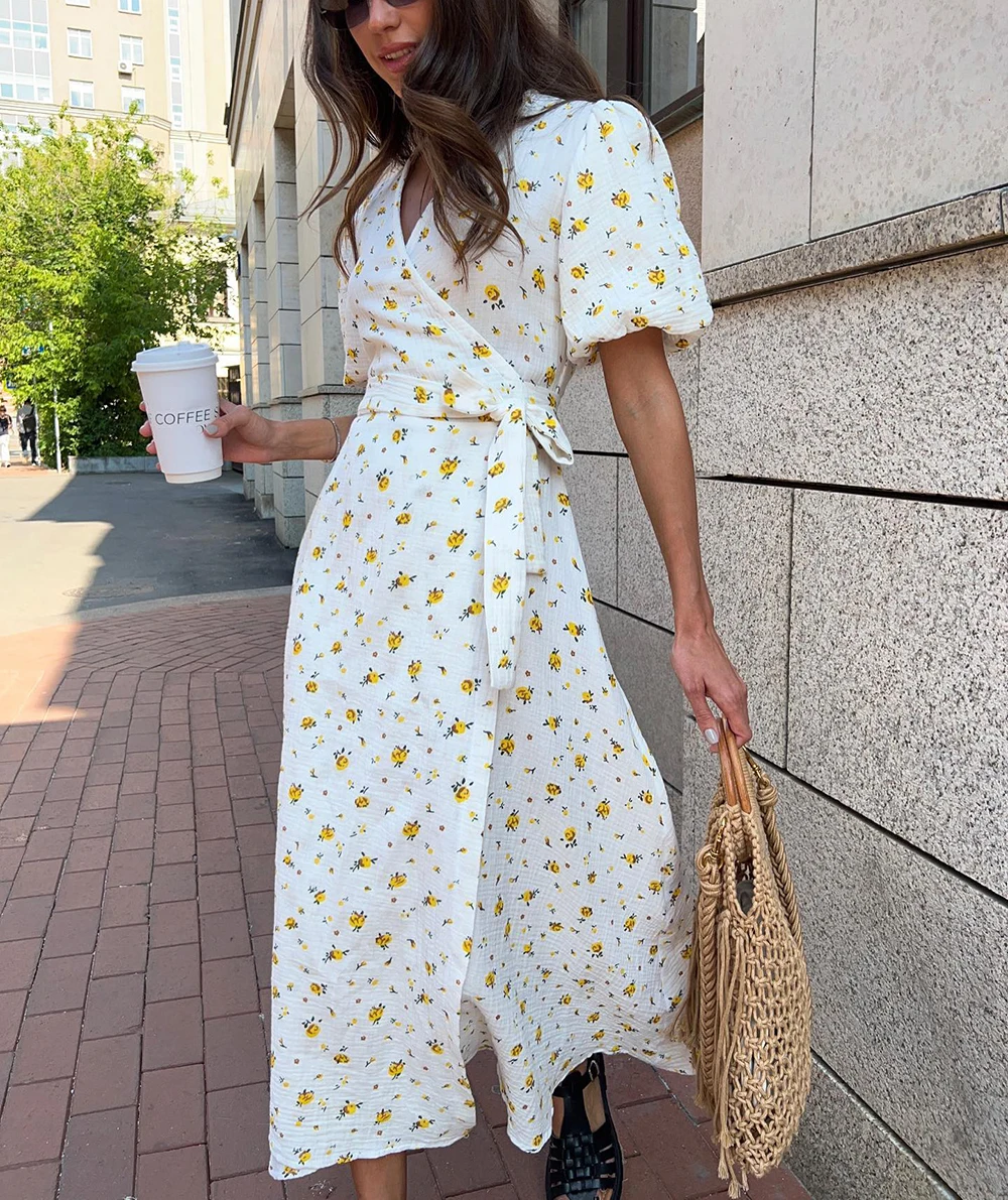 Casual Women’s Summer Dresses 100% Cotton Floral Print A-line Midi Dress with Side Slits Long Elegant White Dress for Women 2025