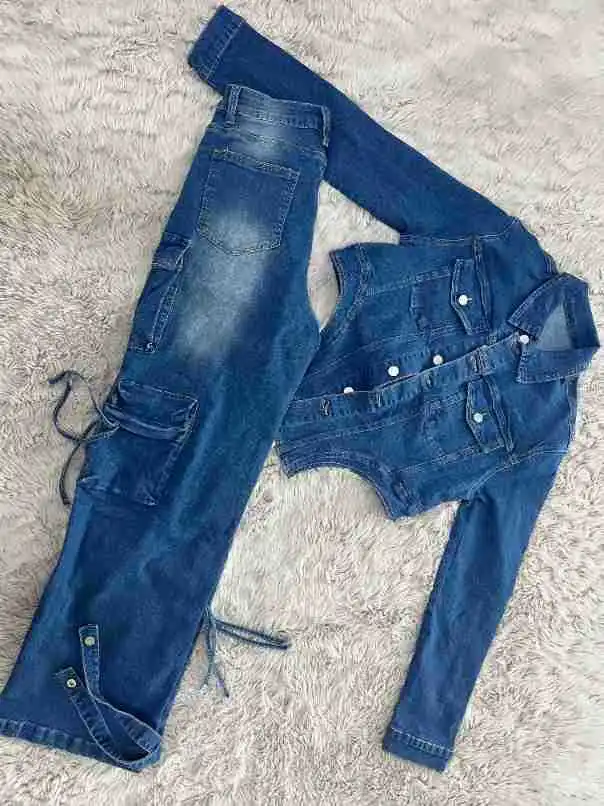 Joskaa Stretch Denim 2 Piece Sets Women Hipster Lapel Full Sleeve Irregular Jacket and Straight Pants Matching Baddie Streetwear