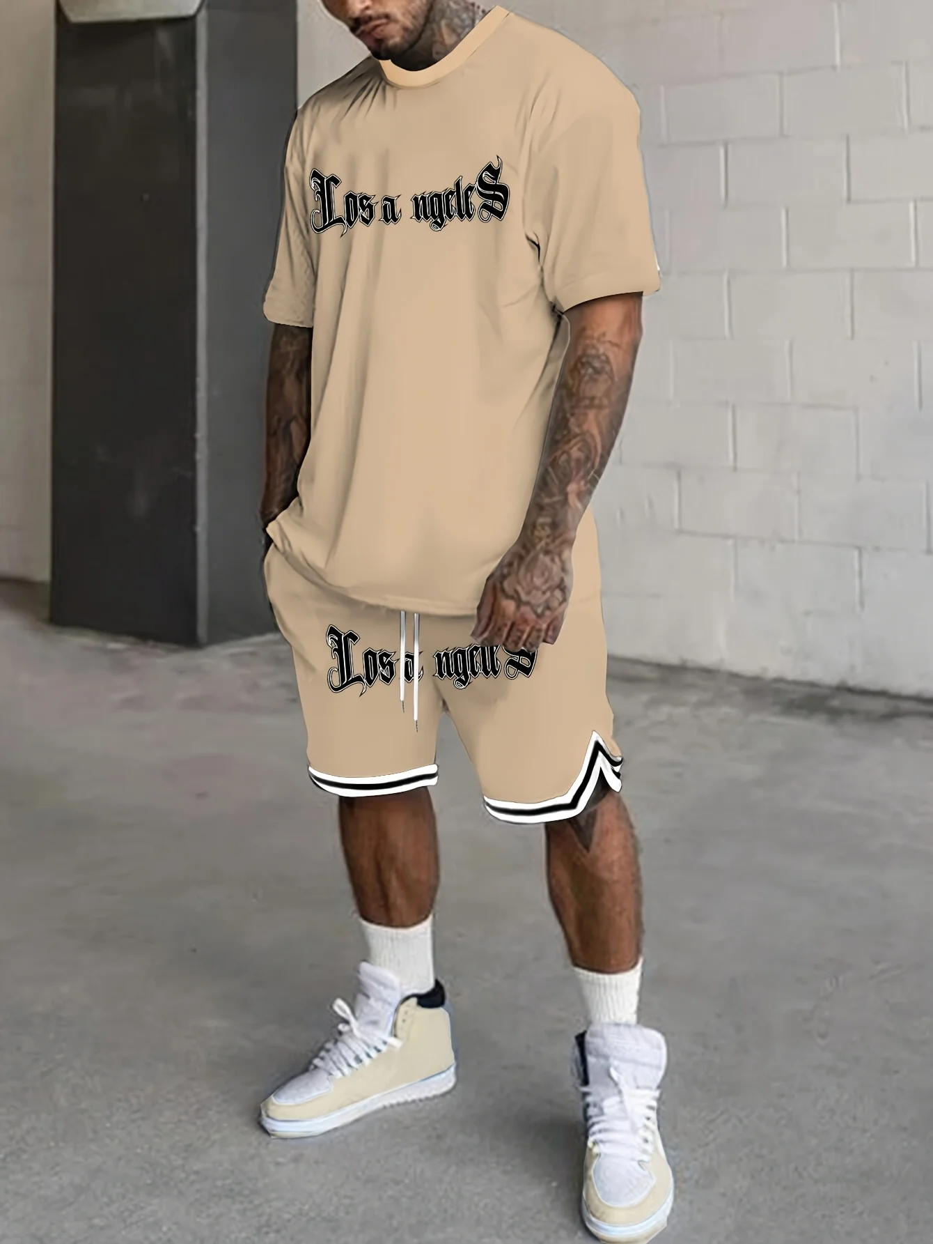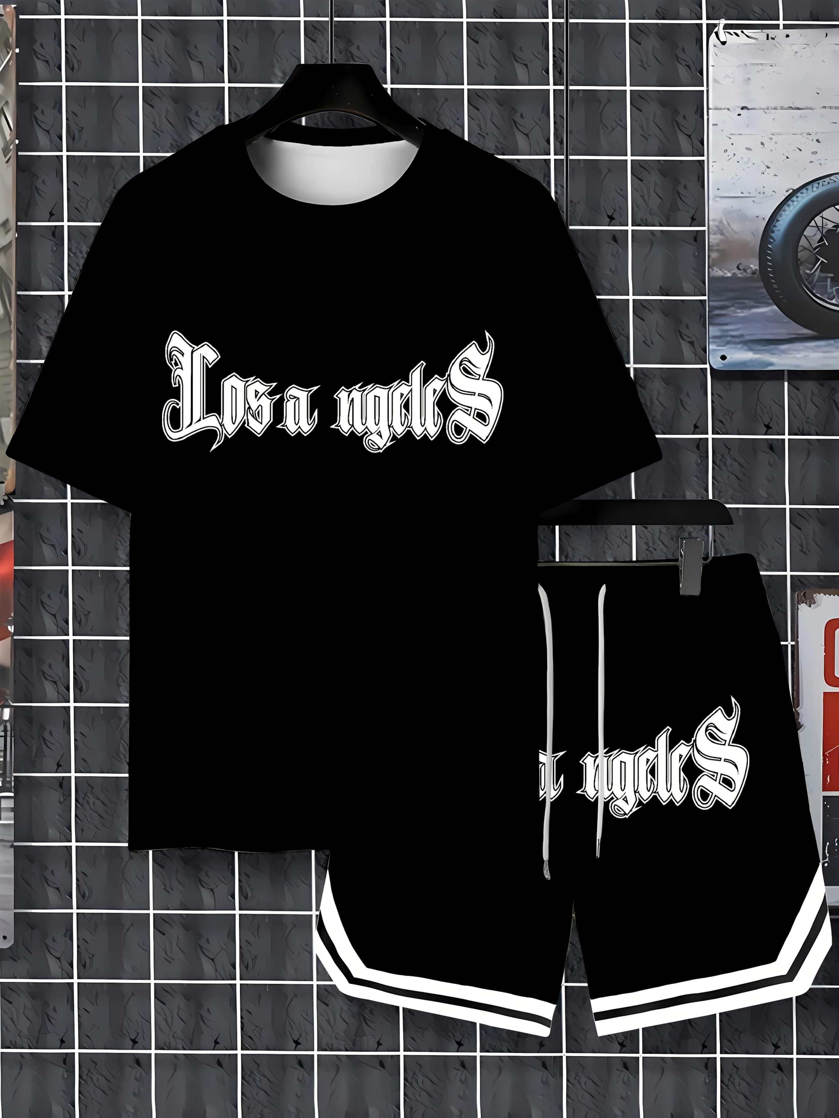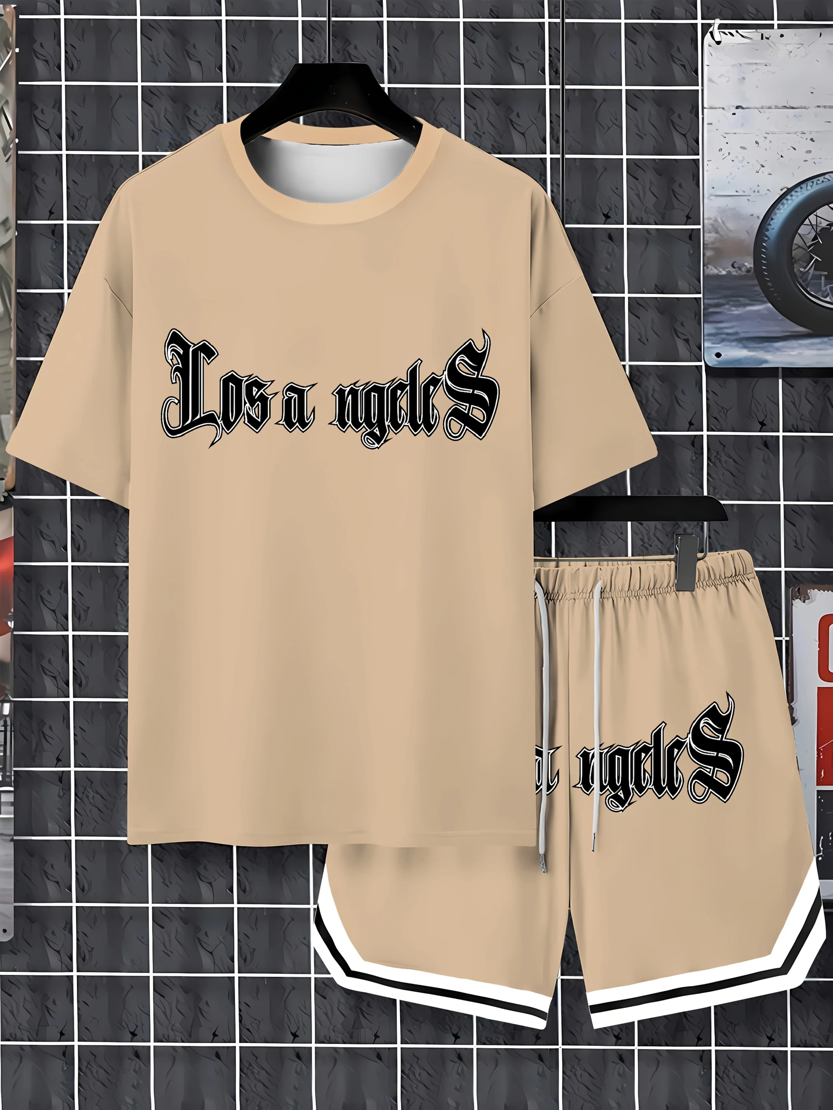 Los Angeles Letter Men’s Casual Suit, Round Neck Short Sleeve Drawstring Shorts Two, Suitable for Summer Daily Outdoor Sports