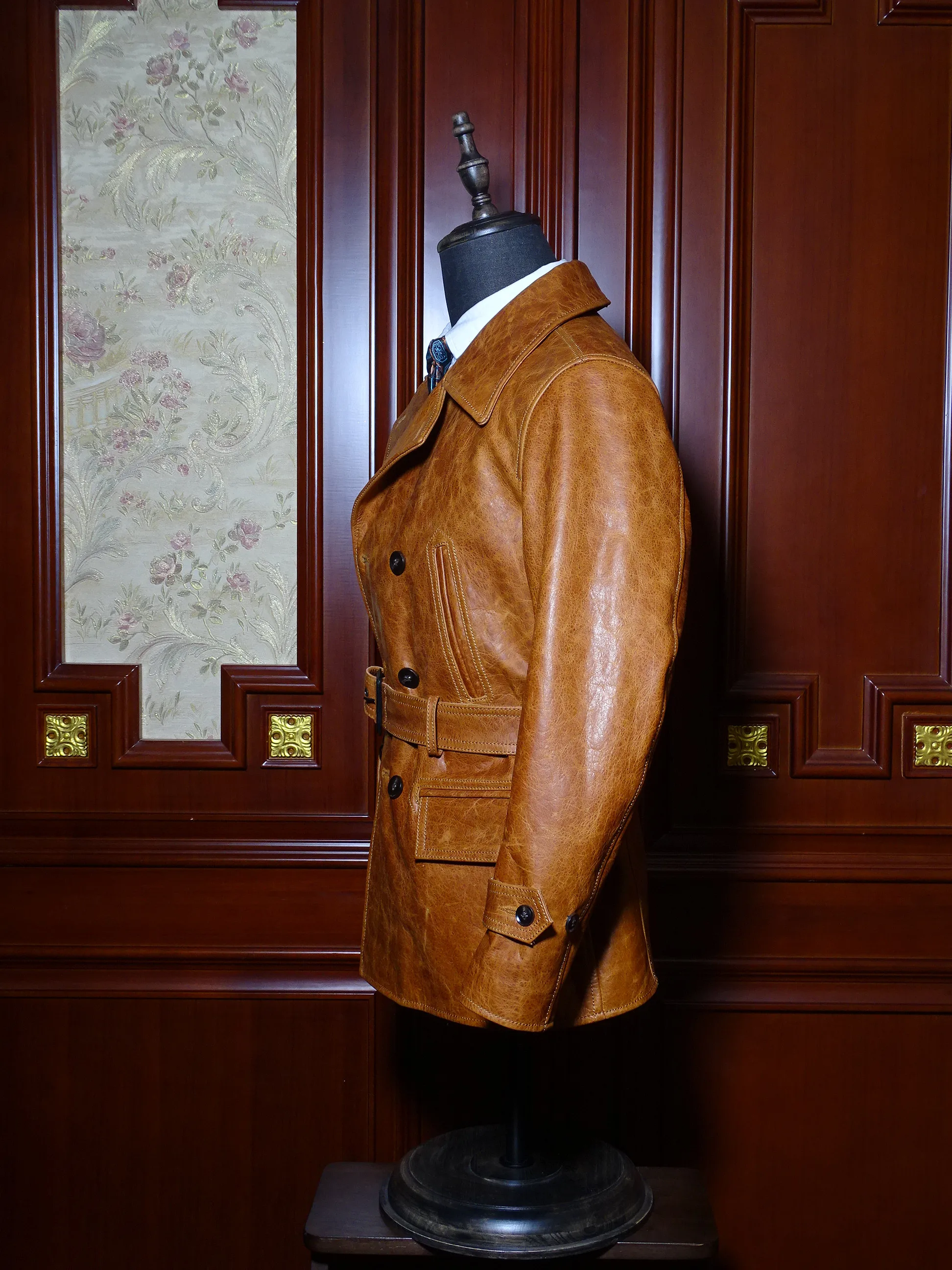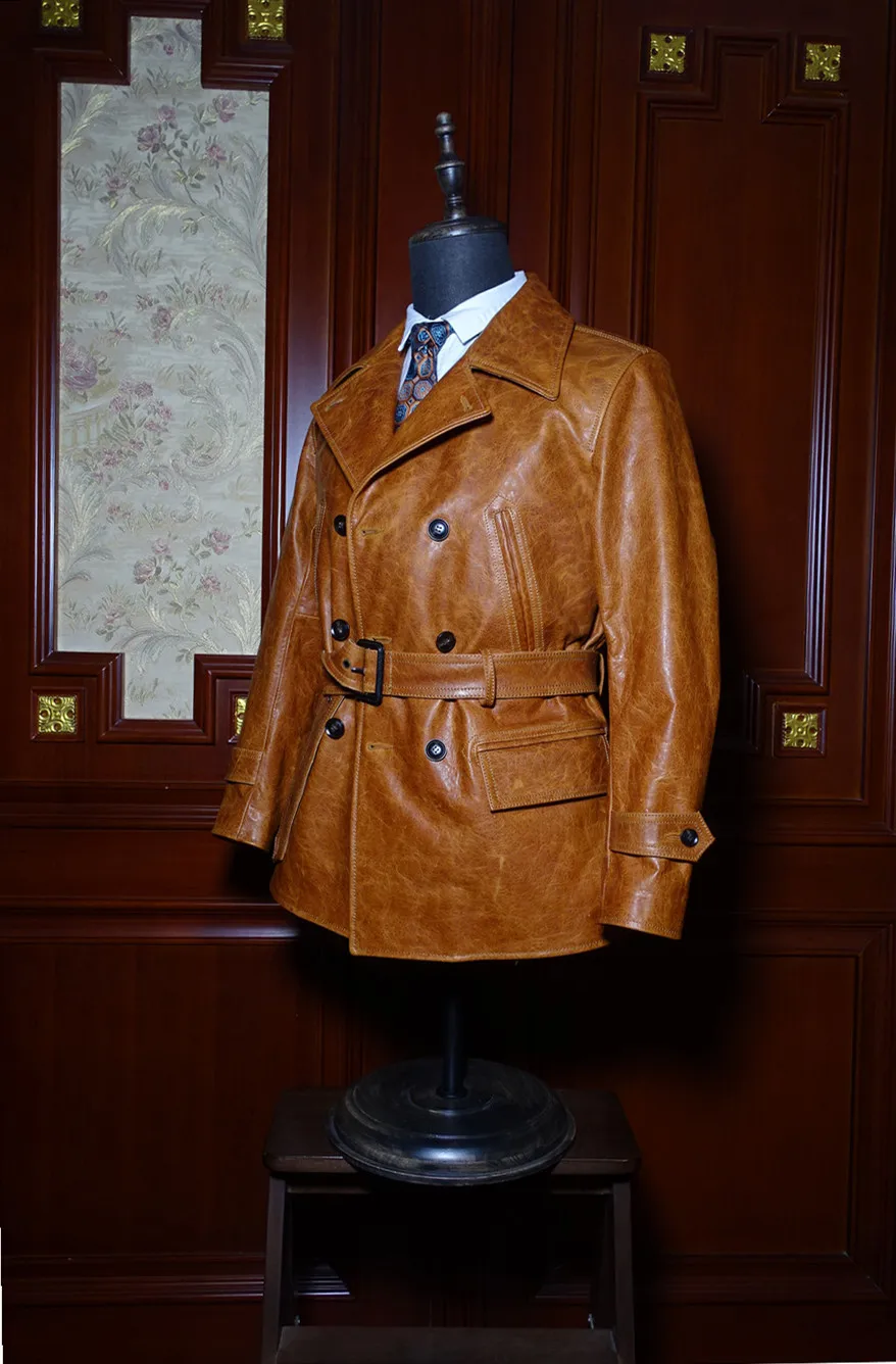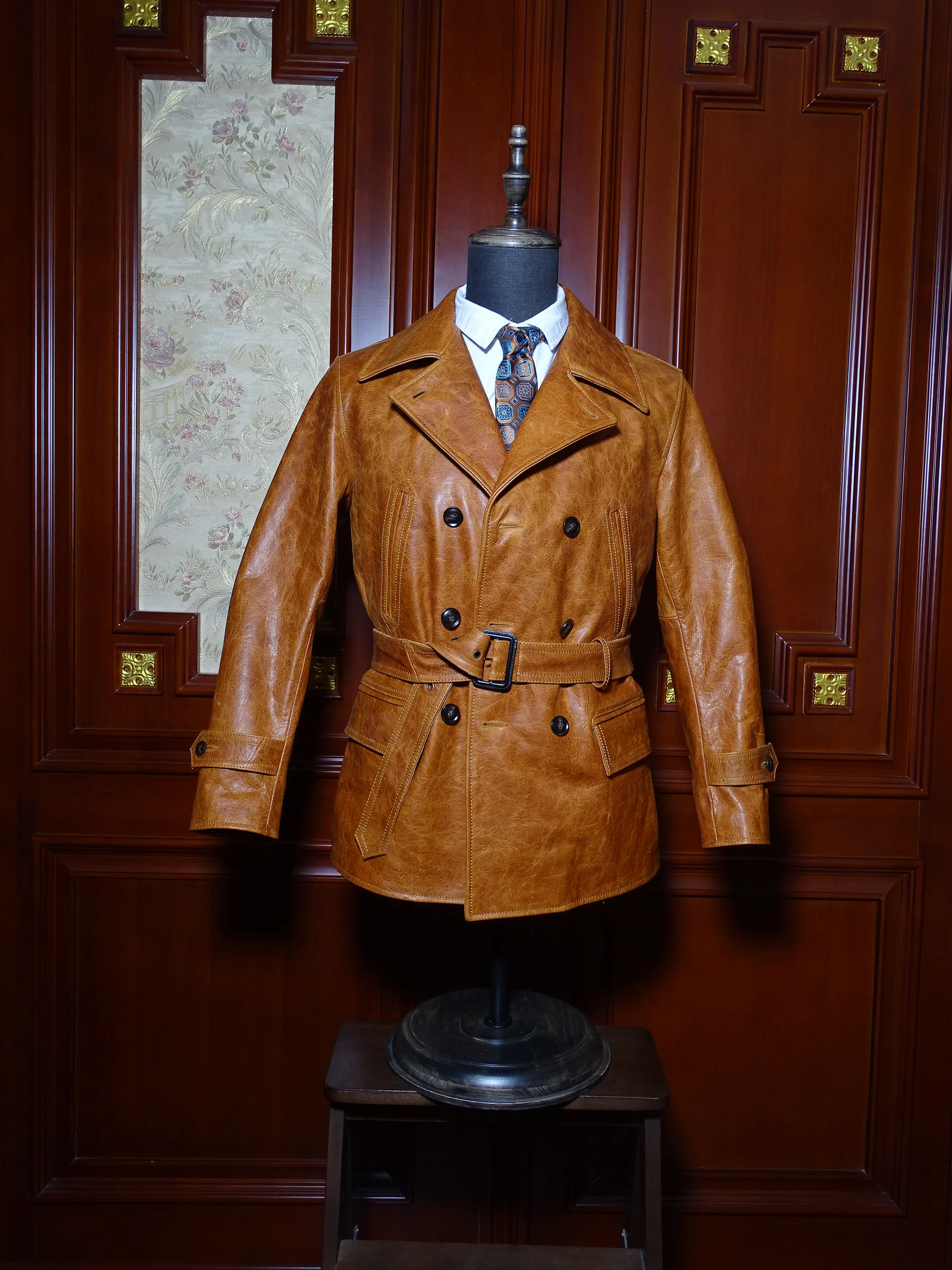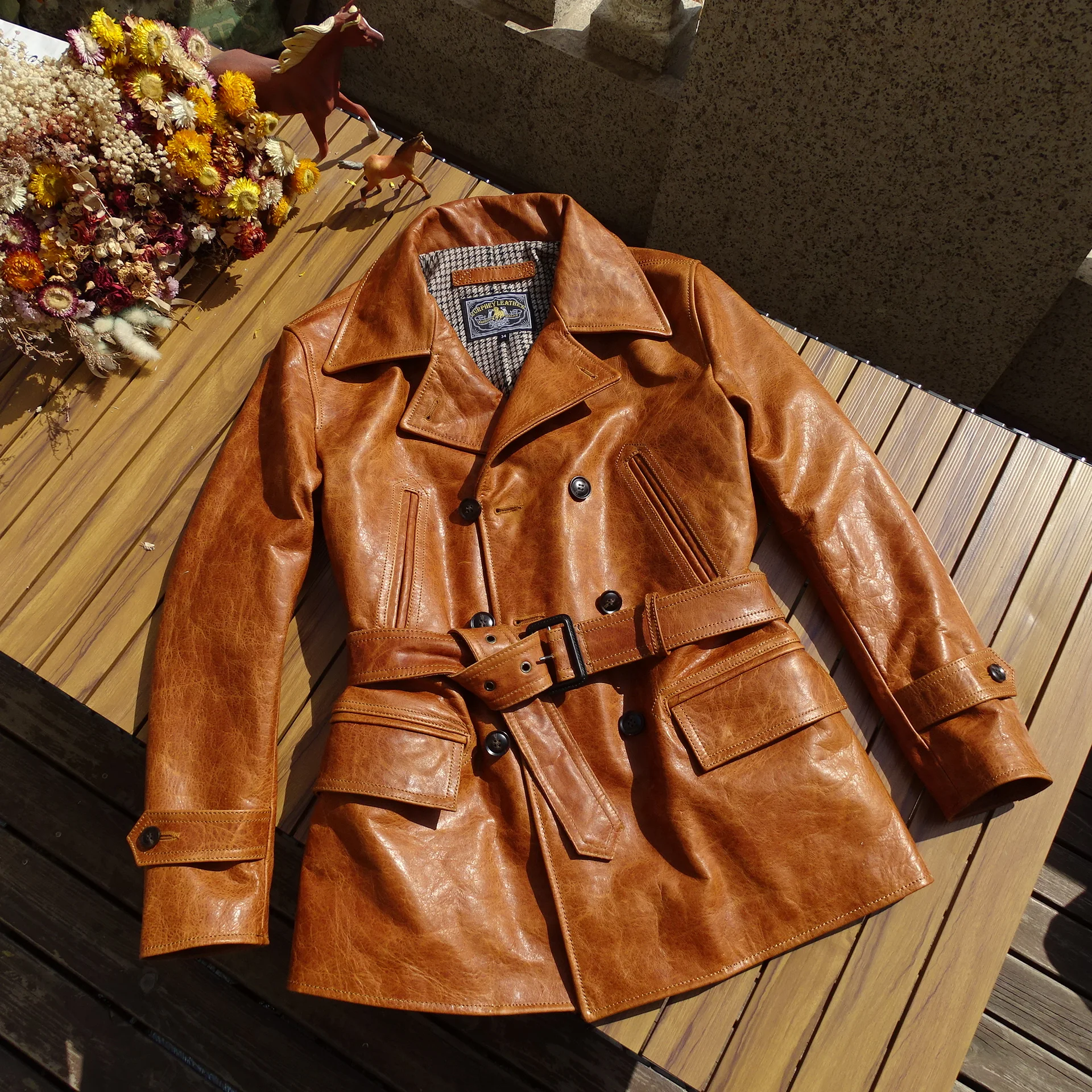 If you are looking for a stylish and durable men’s leather pea coat, you might want to check out this one. It is made of Japan horsehide, a premium leather that is thick, soft and strong. The leather has a natural grain and texture that gives it a unique character and charm. The coat features a double breasted design with a belt that can be adjusted for a snug fit. The coat has two side pockets and one inner pocket for your convenience. The coat comes in a classic ambe color that can match any outfit.