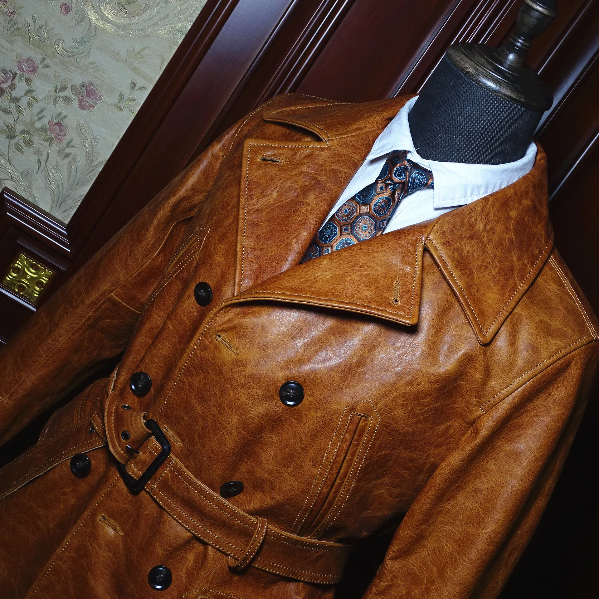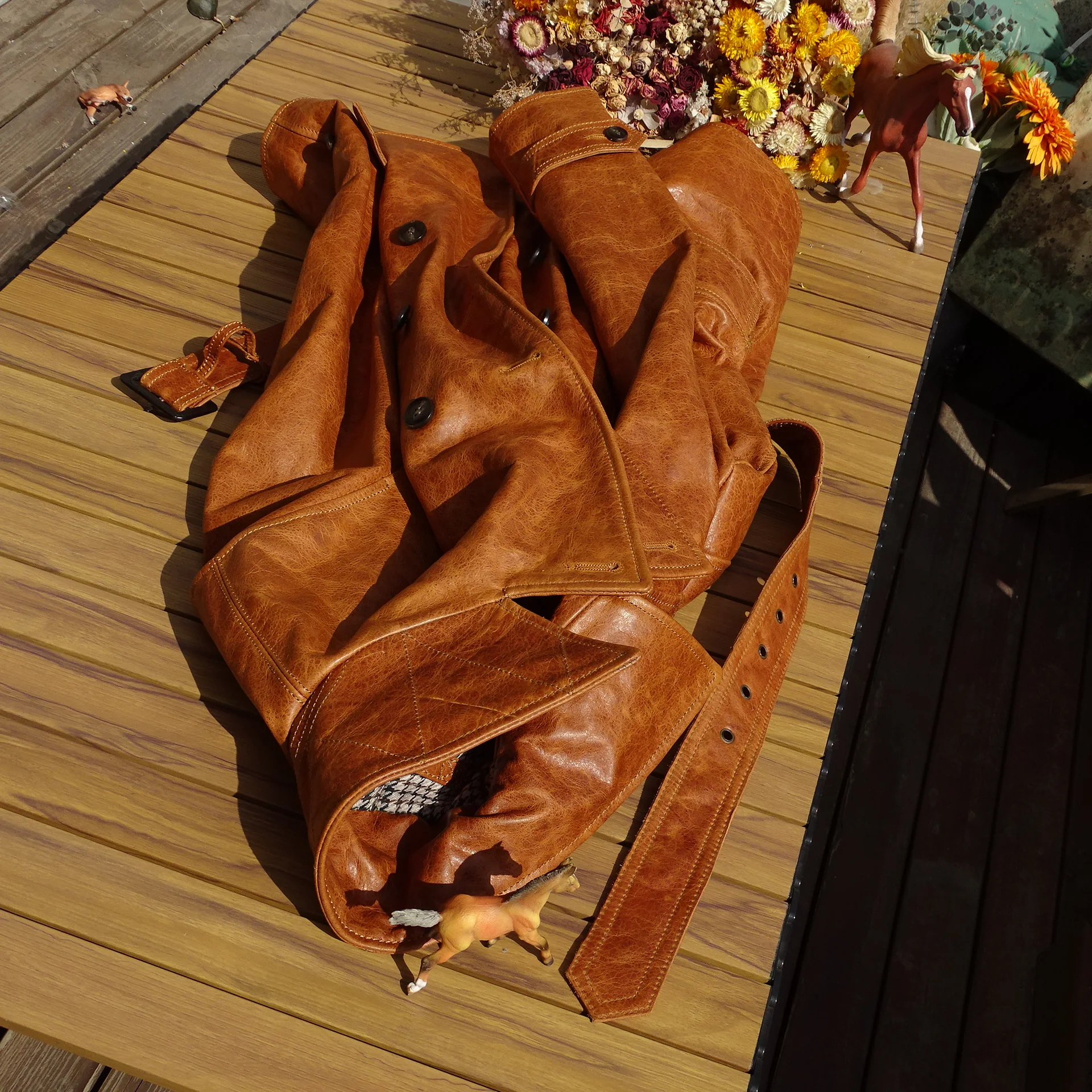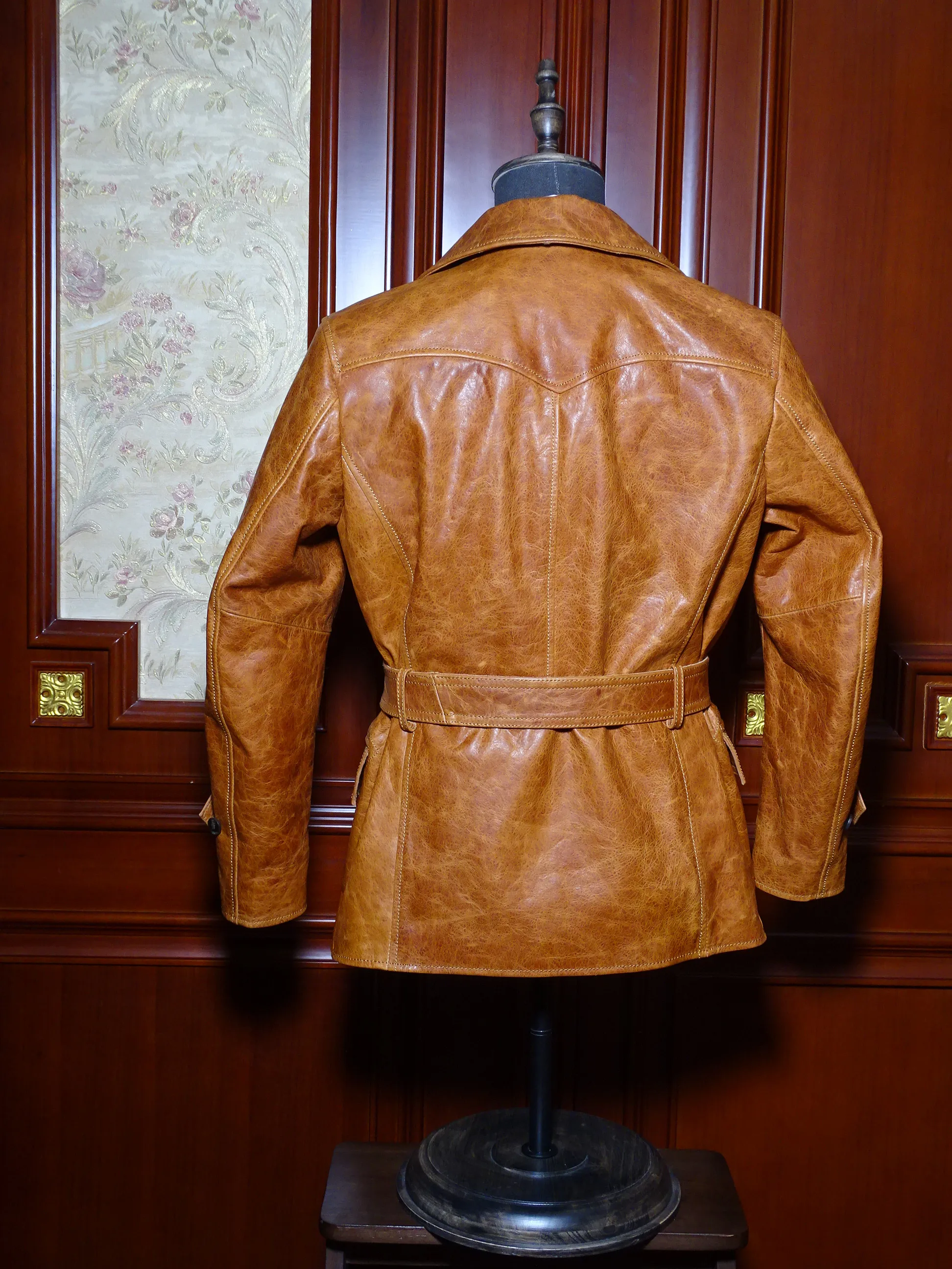 If you are looking for a stylish and durable men’s leather pea coat, you might want to check out this one. It is made of Japan horsehide, a premium leather that is thick, soft and strong. The leather has a natural grain and texture that gives it a unique character and charm. The coat features a double breasted design with a belt that can be adjusted for a snug fit. The coat has two side pockets and one inner pocket for your convenience. The coat comes in a classic ambe color that can match any outfit.