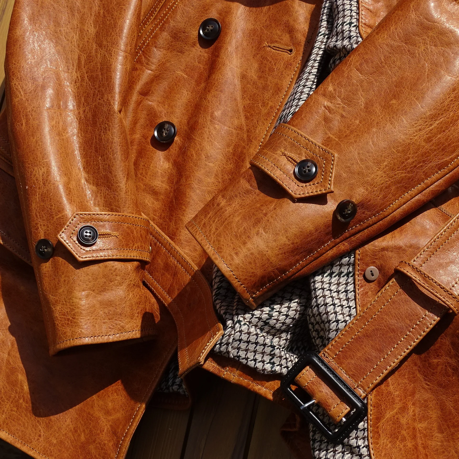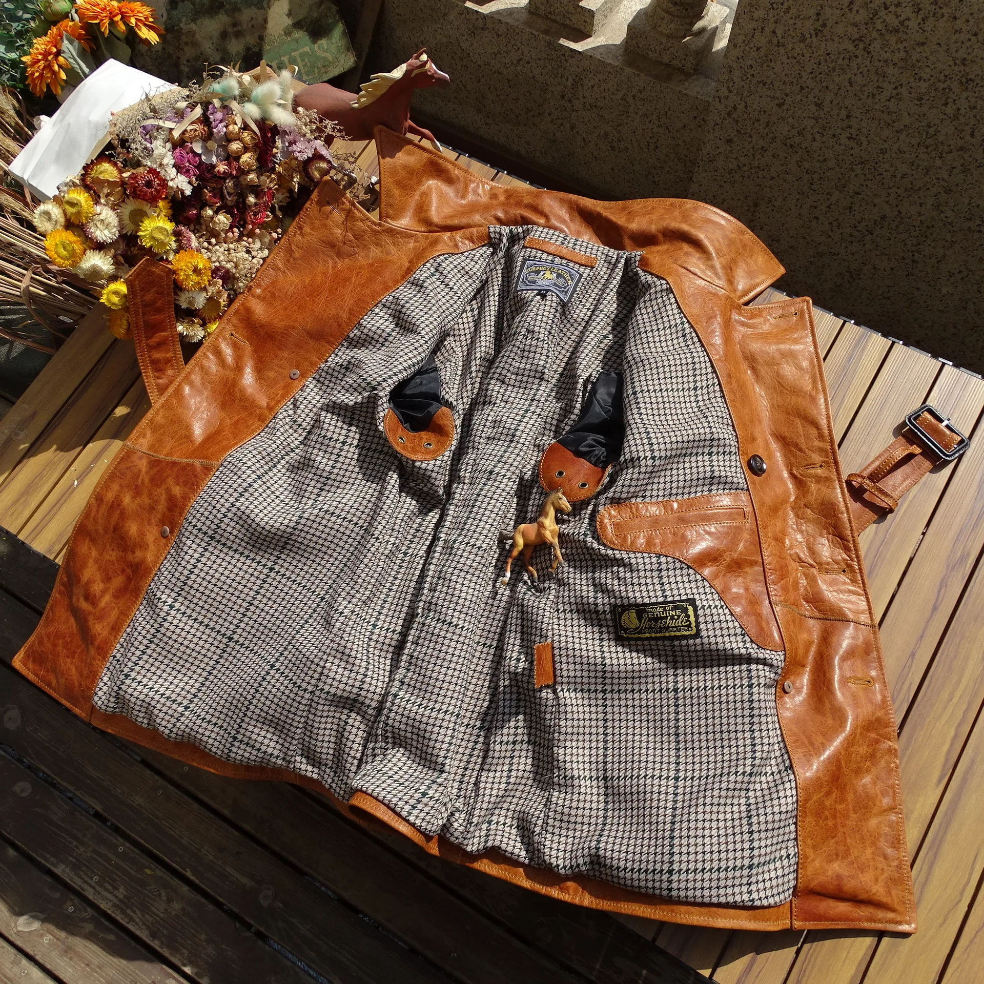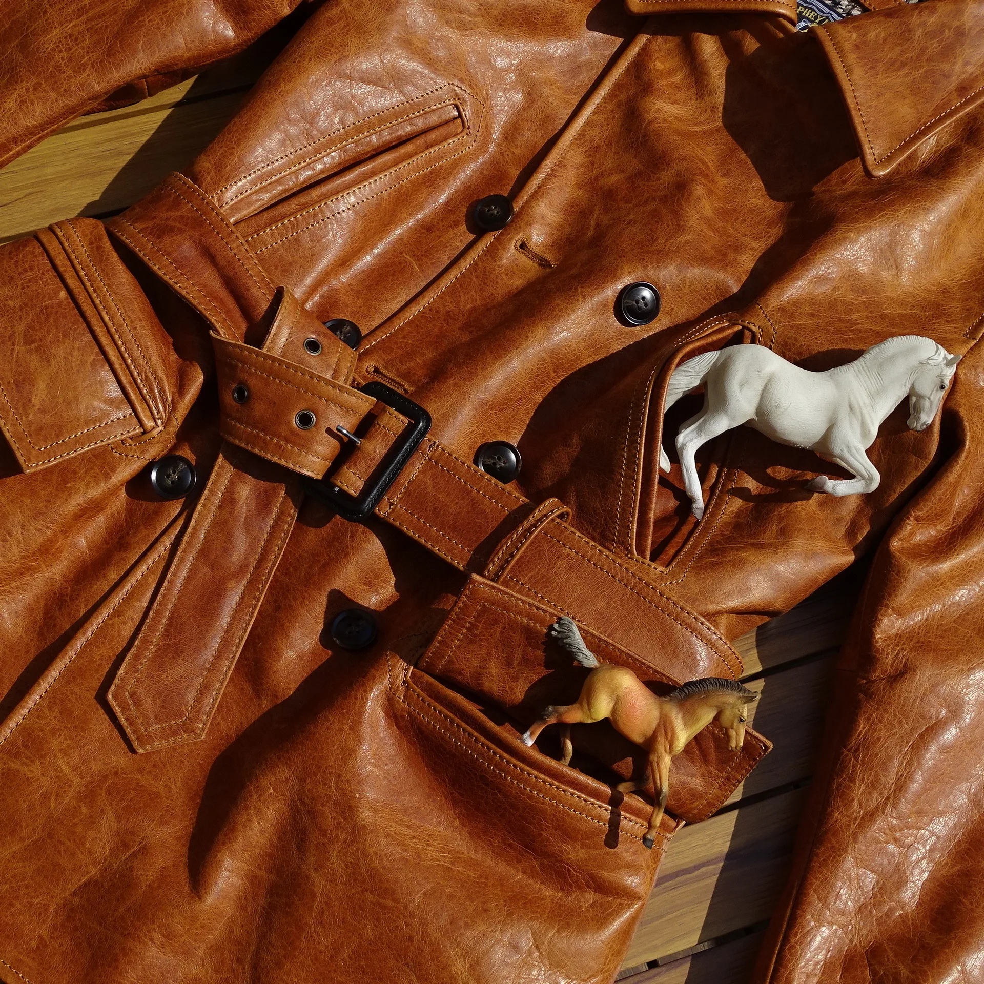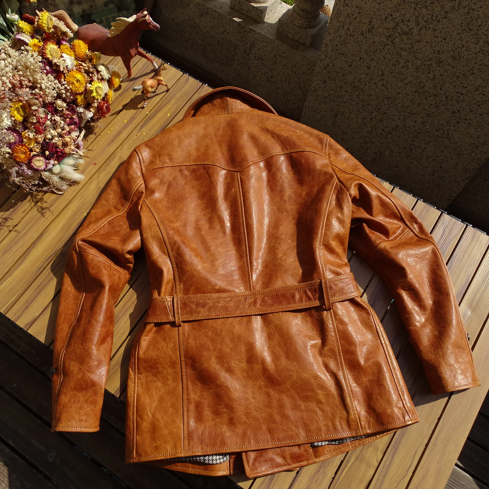 If you are looking for a stylish and durable men’s leather pea coat, you might want to check out this one. It is made of Japan horsehide, a premium leather that is thick, soft and strong. The leather has a natural grain and texture that gives it a unique character and charm. The coat features a double breasted design with a belt that can be adjusted for a snug fit. The coat has two side pockets and one inner pocket for your convenience. The coat comes in a classic ambe color that can match any outfit.