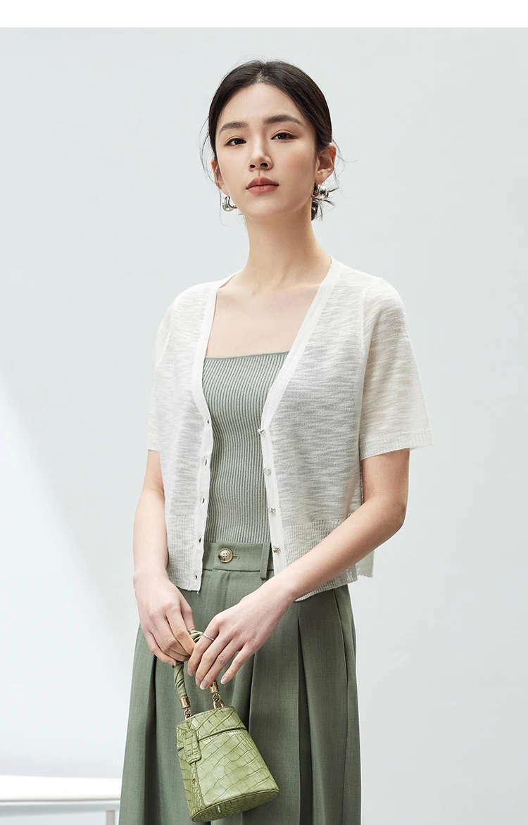 SENTUBILA Soft Short Sleeve Cropped Knitted Cardigan 2024 Summer New Female Knitwears V-neck Single Breasted Tops W42H54604
