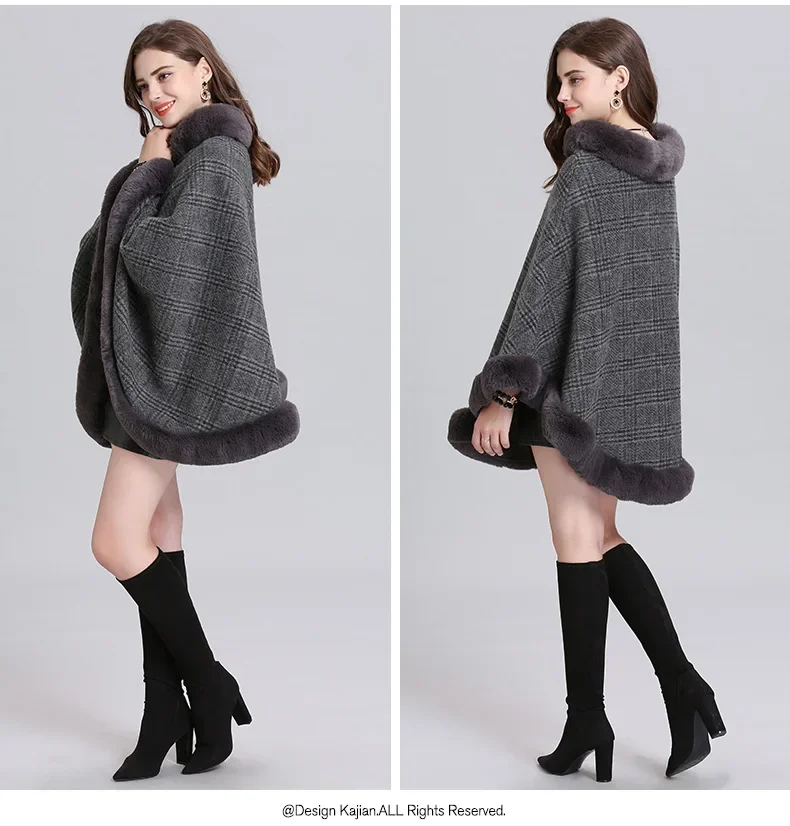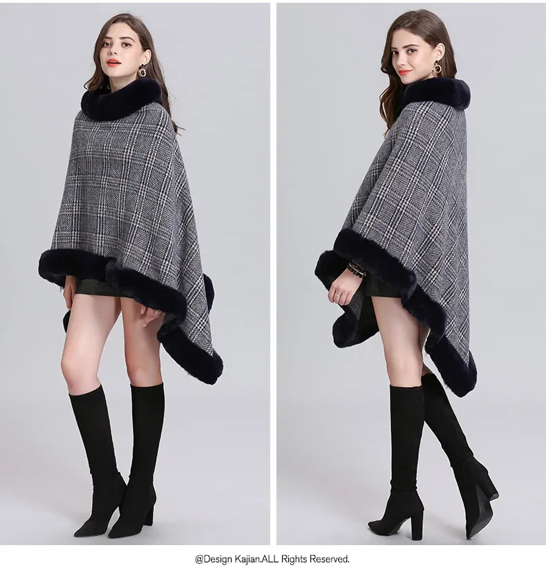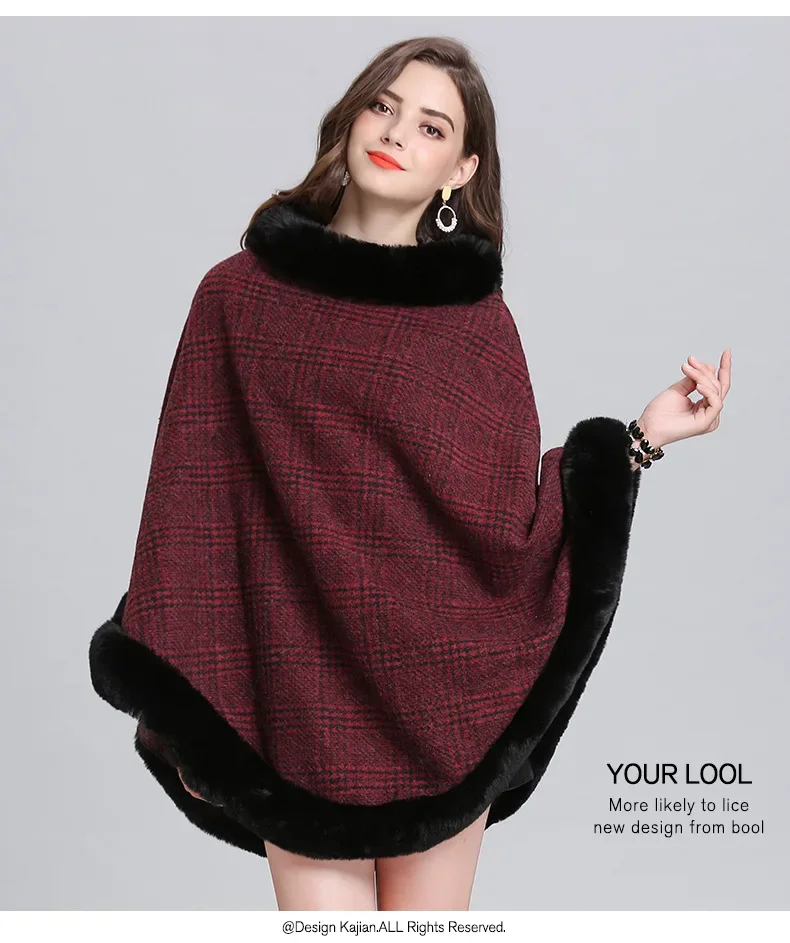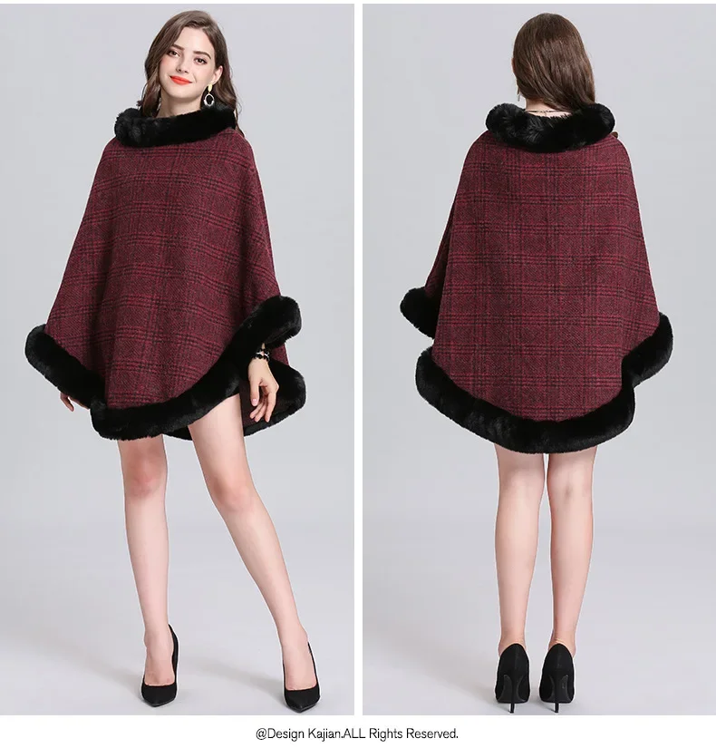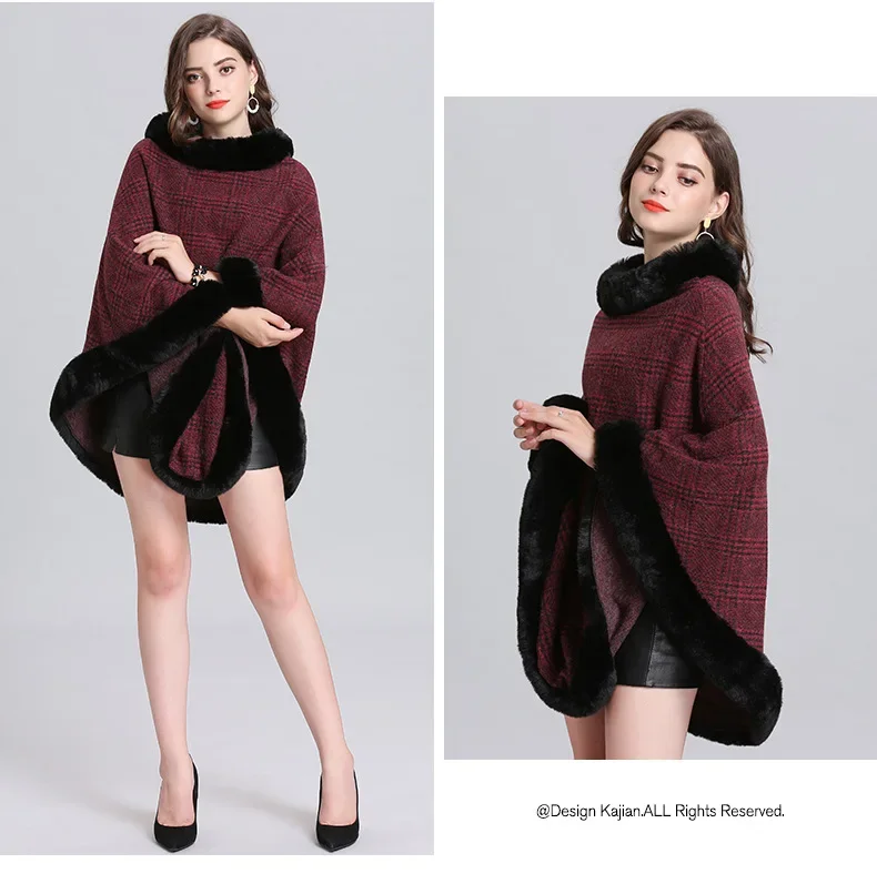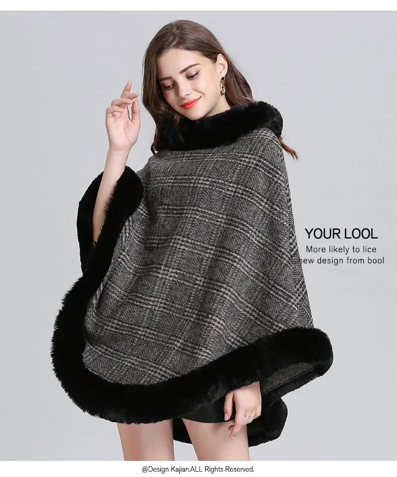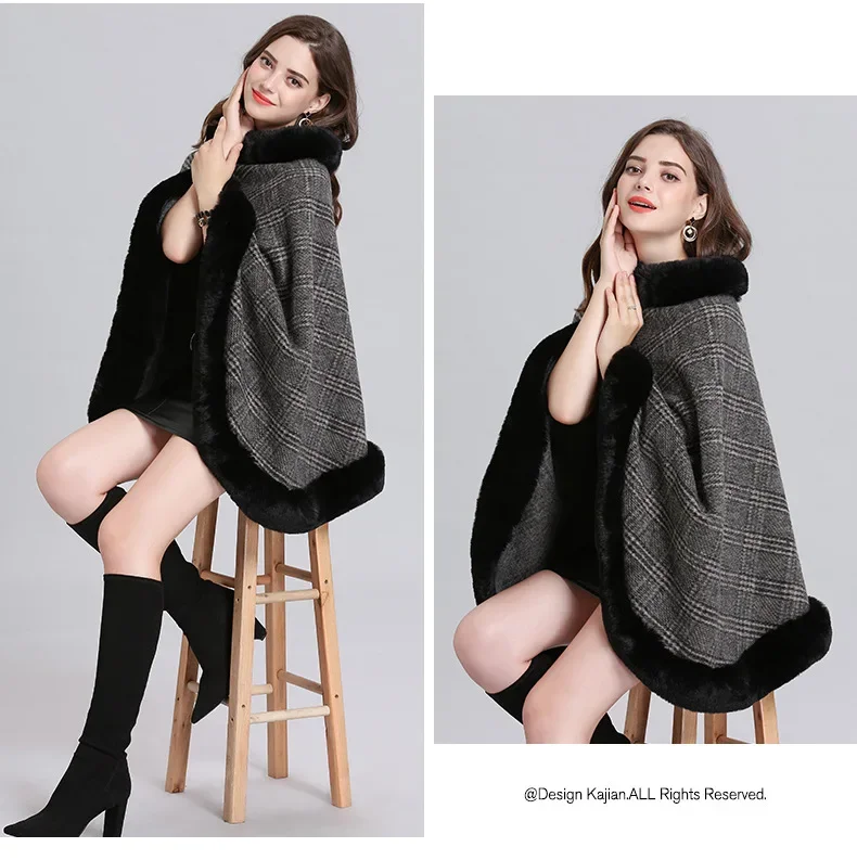 Women Striped Plaid Cape Poncho Overcoat Winter Faux Fox Fur Woolen Loose Streetwear Knitted Oversize Pullover Fur Shawl Cloak
