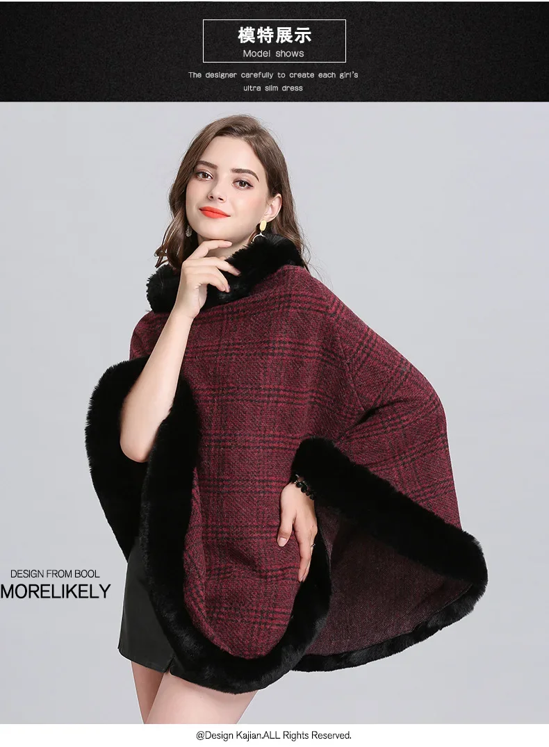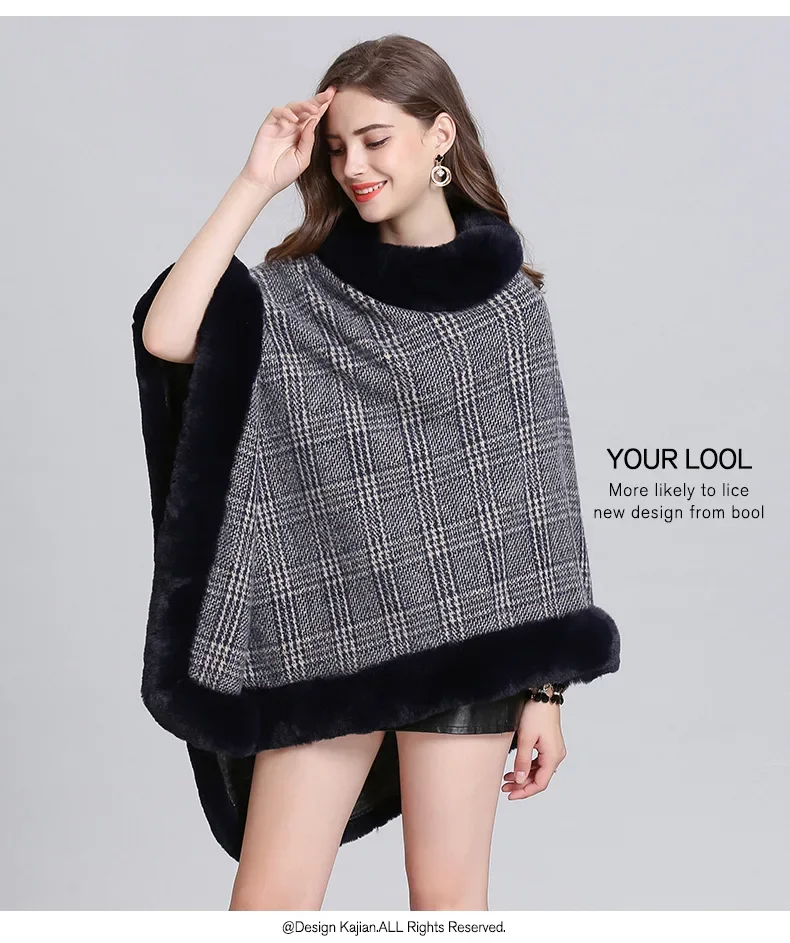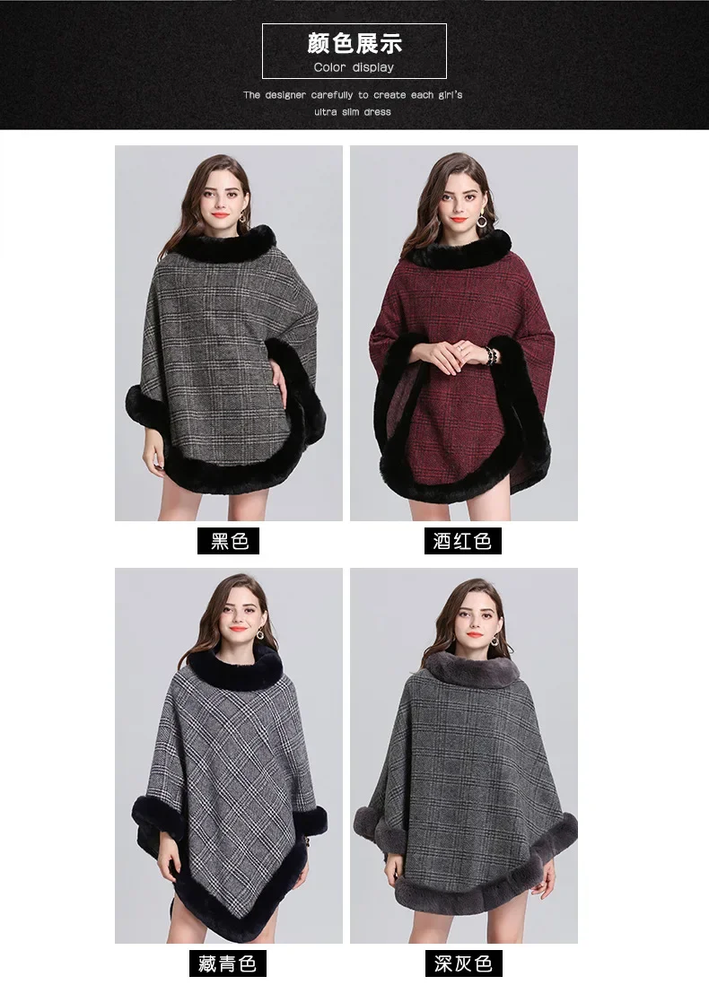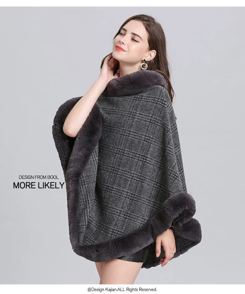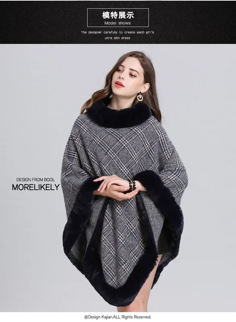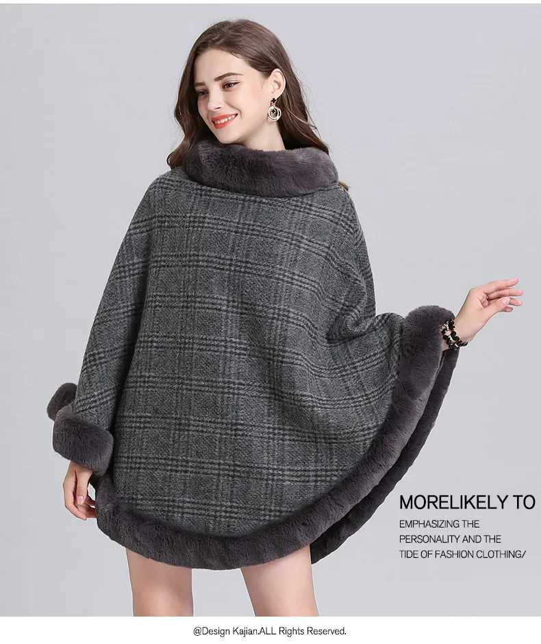 Women Striped Plaid Cape Poncho Overcoat Winter Faux Fox Fur Woolen Loose Streetwear Knitted Oversize Pullover Fur Shawl Cloak