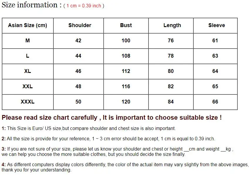 | Size | Asian size M L XL XXL XXXL |